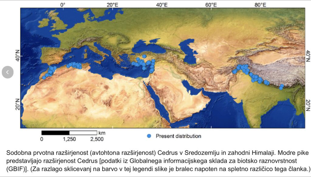 –libanonska cedra (Cedrus libani) in njeni podvrst: turška cedra (Cedrus libani var.stenocoma in ciprska cedra (Cedrus libani var.brevifolia)