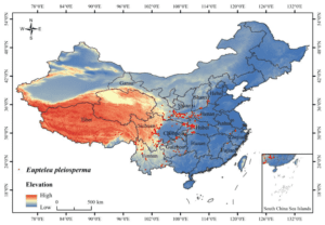 Evpteleja je manjše drevo ali grm, ki zraste 5 do 10 metrov visoko. Njena domovina je Kitajska, Butan in Indija. Uspeva razpršeno v goratih predelih celinske vzhodne Azije na višinah od 700 metrov in se dvigne krepko nad »Triglav«, do 3600 metrov nad morjem. Zaradi te razpršenosti na področju dolgem preko 2500 km je vrsta med seboj genetsko zelo raznolika. Prvi zahodnjak, ki se je leta 1860 srečal z evpteleja v indijskem hribovju Mishmi, je bil britanski botanik William Griffith. Zaradi velikega naravnega rastišča evptelea kot vrsta načeloma ni ogrožena, nekatera izmed teh razpršenih rastišč, pa vendarle so ogrožena. V Evropo je prva semena leta 1896 poslal iz Sečuana francoski misionar Paul Farges v semenarsko podjetje Vilmorin, podobno je 4 leta kasneje storil še angleški lovec na rastline Ernest Wilson. Semena je poslal v Anglijo znanemu podjetju Veitch anad Sons, za katerega je takrat iskal botanične novosti.