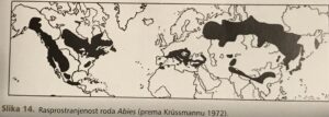 Abies pinsapo – španska jelka: poreklo: ŠPANIJA, MAROKO, višina 25-30 m, premer 1,4 m, starost 250 – 300 let